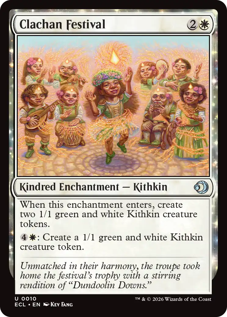 At worst this is a 5 mana enchantment that creates a 1/1 and gives all your creatures +1/+1 (only on your turn), which is pretty good. Very nice payoff to kithkin/token