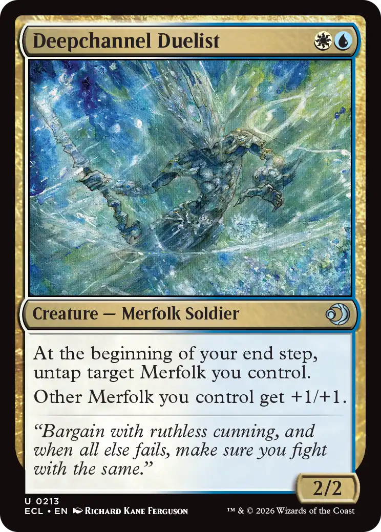 Another cool way to untap your merfolk, not as consistent as the Deepchannel Duelist, but can catch opponents by surprise with it, and then attack next turn to get the extra damage.
