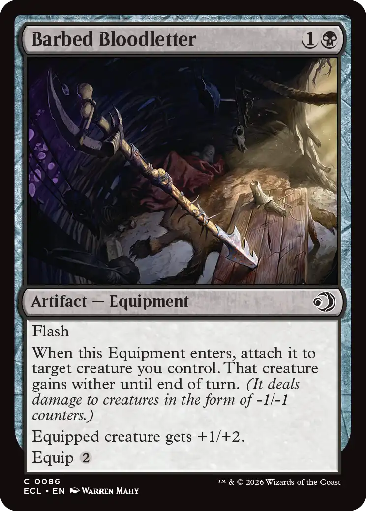 Incredibly fun looking card, I really want to try and get it equipped to a bitterblossom bearer, or in a Cadira, caller of the small commander deck.